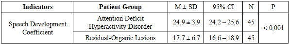 The highest speech development coefficient was observed in children with DSD associated with ADHD (24.9 ± 3.9), indicating a primarily functional nature of speech impairment. In such cases, preserved intellectual and motor potential enables compensation of speech delay when timely corrective interventions are applied.In children with residual-organic brain lesions, the coefficient was significantly lower (17.7 ± 6.7; p < 0.001), reflecting pronounced neurodynamic disturbances, delayed cortical maturation, and persistent cognitive deficits.The findings demonstrate that in children with organic CNS damage, speech function develops more slowly and requires long-term, multidisciplinary rehabilitation. In contrast, DSD associated with ADHD is typically of a functional–discoordinative nature and responds well to neuropsychological and speech therapy methods.