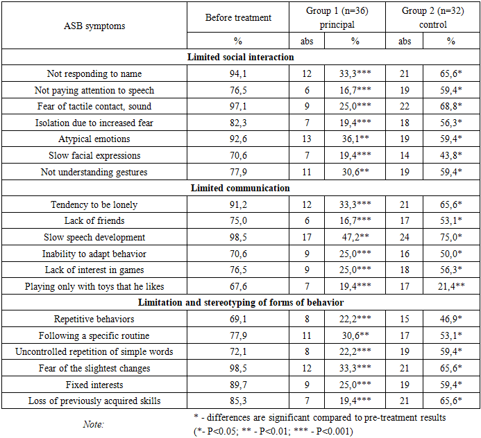 In children with ASD, a comprehensive rehabilitation approach was implemented, taking into account the severity of clinical manifestations as well as the overall severity of the disorder. This approach aimed to provide broad therapeutic effects, foster the development of social, communicative, and daily living skills, address maladaptive behaviors, and improve the quality of life of both the child and the family. The practical rehabilitation protocol included various methods such as behavior analysis (ABA therapy), sensory integration, speech therapy activities, and neuropsychological and cognitive-behavioral exercises.Additionally, children participated in sessions with consultations from a neurologist-rehabilitologist, special education teacher, psychologist, and physical therapy specialist (occupational therapist). As another rehabilitative tool, transcranial magnetic stimulation (TMS) was applied, which involves the non-invasive and painless delivery of brief magnetic pulses to specific regions of the cerebral cortex. The outcomes of the implemented comprehensive rehabilitation program were compared with those obtained from patients who underwent conventional treatment over a 3–4 month period (Table 2).Table 2. Intergroup comparison of ASB "triad symptoms" in rehabilitation  |