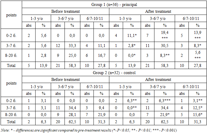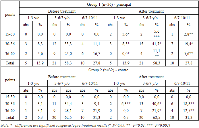 Children who received conventional rehabilitation methods achieved substantially lower results. At the parents’ request, these children were also referred to specialists for application of comprehensive rehabilitation methods after three months.The next stage involved evaluating the dynamics of ASD and communicative impairment severity, using the CARS scale (Schopler, Reichler, DeVellis, & Daly, 1980) (Table 4).According to CARS, the severity of ASD and communicative impairment showed considerable improvement in the primary group. Specifically, 4 children (11.1%) demonstrated a complete reduction of ASD symptoms, reaching practically normal functioning; 25 children (78.1%) exhibited mild or moderate forms of autism (an improvement from severe to mild forms, representing a 1.5-fold reduction compared to pre-treatment levels); and 6 children (16.7%) had severe autism, compared to 17 children (47.2%) prior to treatment, indicating a 2.8-fold decrease. This analysis contrasts markedly with the results of the control group, further confirming the high efficacy of the comprehensive rehabilitation program (Table 4).Table 4. Dynamic assessment of the severity of ASD and communicative disorders according to the CARS scale  |