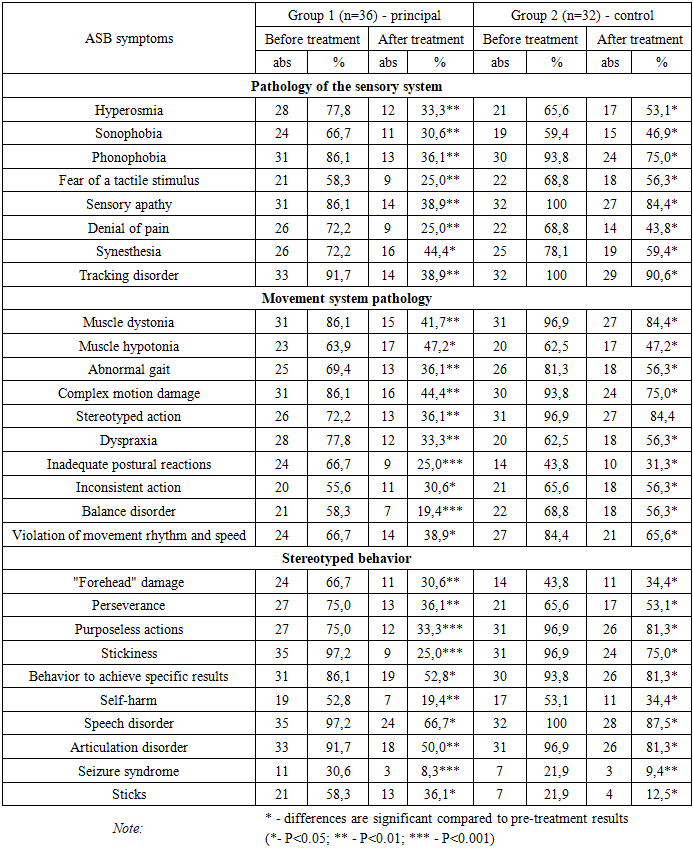 The study did not exclude the observation of neurological changes in patients with ASD during the rehabilitation process. In this case, the same brain changes indicated both the main symptoms of ASD and neurological concomitant lesions. The scope of neurological lesions in ASD is very wide, they are early lesions of the psychomotor state, impaired sensitivity and its processing, monotony of movement and mental reactions, hypermobility, high excitability. Movement stereotypes, impaired motor coordination, dyspraxia, expressive motor skills, speech development, articulation disorders, tics, seizures were observed with such symptoms. During the 3-month rehabilitation period, we identified quite positive, noticeable changes in children (Table 5).Table 5. Dynamic changes of neurological signs in ASB rehabilitation  |