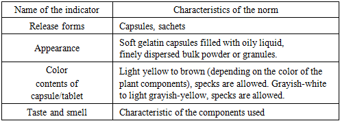 Organoleptic properties of the dietary supplement "Numa Vitamin D3" soft gelatin capsules in terms of smell, color and transparency they corresponded to GOST 1198 (Table 1).Table 1. Organoleptic properties of the biologically active food supplement “Numa Vitamin D3” soft gelatin capsules  |