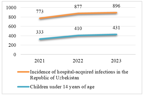 The main factors contributing to the occurrence of nosocomial infections in children include:- weakened immune systems in children;- prolonged hospital stays;- various surgical and invasive procedures;the presence of concomitant diseases (hereditary and genetic conditions). Low body weight in children is also a significant risk factor for the development of hospital-acquired infections, with a higher incidence observed in underweight children compared to those with normal or higher body weight. In addition, frequent visits to hospitalized children—primarily by parents—and the co-hospitalization of mothers with breastfed infants during the hospital stay are considered risk factors for the development of HAIs.Despite the implementation of preventive measures in hospitals, the incidence rate remains high. However, the actual number of hospital-acquired infections is often underreported, which negatively affects the effectiveness of prevention and control measures aimed at reducing HAIs.According to the results of the conducted analysis, the incidence of hospital-acquired infections in the Republic showed the following intensive indicators: 2.2 in 2021, 2.5 in 2022, and 2.5 in 2023. By 2023, an upward trend in incidence can be observed.The incidence of nosocomial infections among children under 14 years of age was 333 cases in 2021, 410 cases in 2022, and 431 cases in 2023 (absolute numbers). In proportion to the overall increasing trend of hospital-acquired infections in the population of the Republic, the occurrence of nosocomial infections among children has also been rising (Figure 1,2). | Figure 1. Absolute numbers of hospital-acquired infections in the Republic of Uzbekistan in 2021–2023 (total population and children under 14 years of age) |