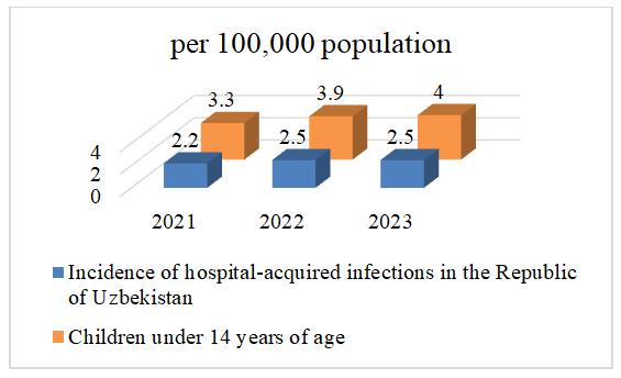 The coming of the main factors appear nozokomial infections in children: in children with weak immunity, the patient to remain in the long term, and different operating manipulyasiya are coming together other diseases ( hereditary and genetic). The incidence of hospital infections in the republic of 2021-2023 the condition of the inside of the epidemiological analysis is done when the 773 units in the year 2021, 2022-year units, 877, 896 units in the year 2023, while the incidence of the condition was recorded. Also as seen, incidence trends 2021-2023 compared to the year coming into the year, have increased dramatically. The inside of the incidence of hospital infections in children under the age of 14 indicators with absolute 333 units in the year 2021, 2022-year units 410, 431 continues up than while in the year 2023. Regional analysis carrying make the most high indicators 2021-year of Tashkent city (57,35%) and Andijan region (18,6%) was recorded. In the year 2022, while Tashkent, Samarkand and Andijan regions, respectively 51,5%, 15,6% and 8,8% was recorded with. According to the survey results, in the year of 2023 hospital infections in children under the age of 14 with the inside of the incidence of the condition has established the following: the city of tashkent, 57,3%, at Andijan region by 11.6% and Samarkand, the region Surhondaryo 5,8%.