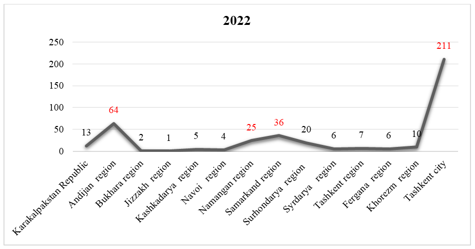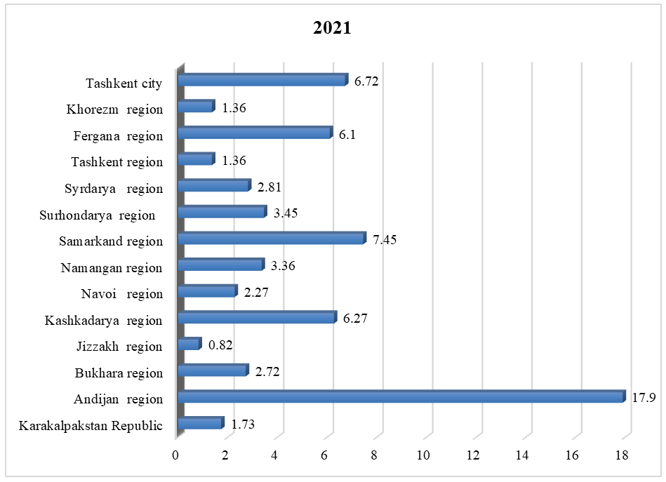 This trend can be explained by the emergence of factors that facilitate the increase in hospital-acquired infections under modern conditions, including the rapid development of medical technologies over recent decades and changes in the country’s socio-economic situation. These findings indicate the need for the healthcare system to revise and enhance the effectiveness of preventive strategies aimed at controlling hospital-acquired infections.According to regional analysis, in 2021, the highest incidence of hospital-acquired infections among children under 14 was observed in Tashkent city (57.35%) and Andijan region (18.6%). The lowest incidence rates were recorded in Bukhara, Jizzakh, and Tashkent regions, while Sirdaryo region reported no cases in 2021 (Figure 3). In 2022, the highest incidence rates were observed in Tashkent city (51.5%), Andijan region (15.6%), and Samarkand region (8.8%), whereas the lowest rates were reported in Jizzakh, Bukhara, and Navoi regions (Figure 4). | Figure 3. Incidence of nosocomial infections among children under 14 years of age in 2021 by region |
