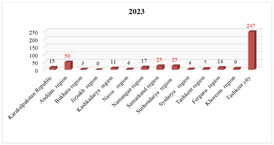 In 2023, the incidence of hospital-acquired infections among children under 14 was 57.3% in Tashkent city, 11.6% in Andijan region, and 5.8% in Samarkand and Surkhandarya regions. Low incidence rates were observed in Bukhara, Navoi, and Sirdaryo regions, and no cases were reported in Jizzakh region (Figure 5). | Figure 5. Incidence of nosocomial infections among children under 14 years of age in 2023 by region |