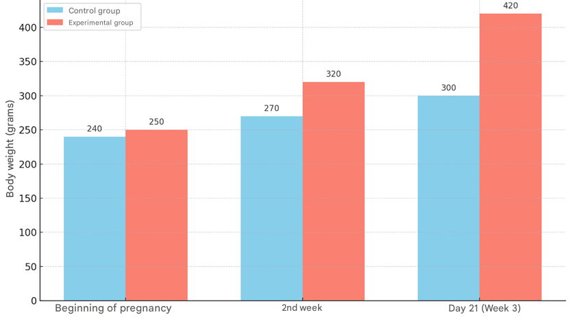 The studies were conducted from 2022 to 2025 in the vivarium of the Termez branch of the Tashkent Medical Academy. For the study, 15 white laboratory mother rats weighing 160-180 grams and 120 baby rats born from them were used. The white rats taken for the experiment were divided into 2 groups.The first group was the control group, consisting of 7 female rats weighing 180-220 grams, without clinical signs of somatic and infectious diseases. The rats in the control group were constantly fed a traditional diet, with free access to food and water. After the rats became pregnant and gave birth to their offspring, 1.0 ml of saline solution was injected into the stomach of the mother rats every morning during the lactation period. A transvaginal catheter was used as a probe.In the second group, we induced an experimental metabolic syndrome model in 8 female rats weighing 180-220 grams. After the rats were healthy, and signs of infectious and somatic diseases were excluded, they were fed a diet rich in fat and carbohydrates. The diet of the rats consisted of 60% laboratory food, 20% mutton fat, and 20% fructose. Drinking water was replaced with a 20% fructose solution. After the start of the experiment, male rats were added to the female rats until it was confirmed that metabolic syndrome had been induced, and during the period of pregnancy, the female rats were fed a full diet rich in fat and carbohydrates.Laboratory white rats in the control and experimental groups were kept under the same conditions of the vivarium. The number of rats in each cage did not exceed 6. Rat pups were euthanized under ether anesthesia on days 3, 7, 14, 21, and 28 after birth. The body weights of the control and experimental laboratory white rats were measured. Blood was also collected from the tail vein of the mother and pups, and the levels of glucose, triacylglycerol, total cholesterol, LDL (low-density lipoprotein), and HDL (high-density lipoprotein) were determined. Plasma glucose levels were determined using a glucometer (Accu-Chek Performa; Roche Diagnostics, Indianapolis, Indiana, USA). Total cholesterol, high-density lipoprotein (HDL), and total cholesterol were determined using an automatic biochemical analyzer (Mindray, BS-200, China). Tissues from the ventricular myocardium and interventricular septum were obtained for histological examination. Myocardial tissue was fixed in 10% formalin solution, processed in growing alcohol and prepared paraffin blocks. Histological preparations of 8-12 μm were prepared from the prepared paraffin blocks and stained with hematoxylin and eosin.Morphometric examinations were performed using the G.G. Avtandilov method and the NanoZoomer (REF C13140-21.S/N000198/HAMAMATSU PHOTONICS /431-3196 JAPAN) Hamamatsu (QuPath-0.4.0, NanoZoomer Digital Pathology Image) morphometric computer program. The obtained data were analyzed in the statistical section of Microsoft Excel 2010 to determine the arithmetic mean Mni, the average error of relative measurements m and the precision coefficient t. Micrographs of histological preparations were taken using a CX40 model OD400 camera microscope.Mother rats with metabolic syndrome in the experimental group decreased their food and water intake during the first 10 days of the experiment, and in the following days, they adapted to food, kept calm, and increased their food and water intake. During the experiment, obesity, hyperglycemia, hyperlipidemia and other metabolic changes were observed in rats fed a modified diet for 4–6 weeks. At the beginning of pregnancy, the body weight of rats of the experimental group was on average 10 g (4.2%) higher than that of the control group. This difference indicates the onset of body fat accumulation when experimental group rats were exposed to a metabolic syndrome-inducing diet (60% laboratory chow, 20% sheep fat, 20% fructose, and 20% fructose solution). By the 2nd week of pregnancy, the average weight of the rats in the experimental group was 320 g, which was 50 g (18.5%) higher than that of the control group. The largest difference was observed on the 21st day of pregnancy (3rd week): the rats in the experimental group weighed an average of 420 g, and in the control group - 300 g (Fig. 1). This was a difference of 120 g or 40% (p<0.05), indicating the aggravating effect of metabolic syndrome associated with obesity and hyperhydration. | Figure 1. Dynamics of body weight of pregnant rats in control and experimental groups during gestation |