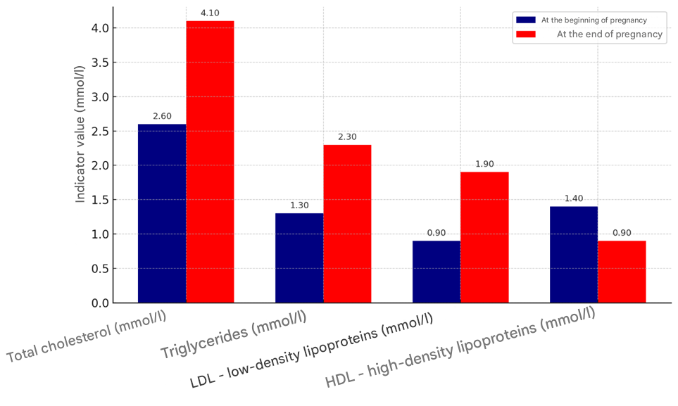 The results of the study clearly demonstrated a serious violation of lipid metabolism in pregnant rats against the background of metabolic syndrome. The difference between the indicators measured at the beginning and at the end of pregnancy on the 21st day of pregnancy indicated the development of dyslipidemia with high atherogenic potential. The total cholesterol level in pregnant rats in the control group was on average 2.6 mmol/l, while in the experimental group this indicator was 4.1 mmol/l, which was 57% higher than in the control group. The triglyceride level in the control group was 1.3 mmol/l, while in the experimental group this indicator increased by 77% and averaged 2.3 mmol/l. LDL (low-density lipoproteins) was found to increase by 111.1%, and this indicator was on average 0.9 mmol/l in the control group and 1.9 mmol/l in the experimental group. HDL (high-density lipoprotein) in the control group was 1.4 mmol/l and in the experimental group it was 0.9 mmol/l, that is, this indicator was found to be 36% lower in the experimental group (Figure 2).  | Figure 2. Changes in lipid metabolism indicators in control and experimental pregnant rats (at 1 and 3 weeks of gestation) |