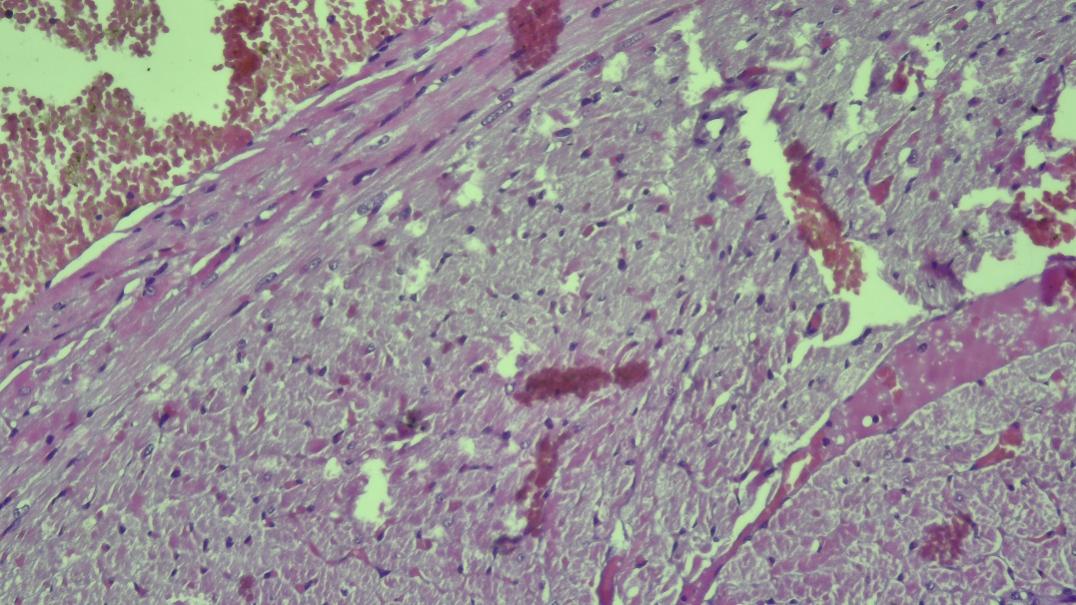 This swelling process occurs with a significant expansion and spread of collagen fibers. The myocardium itself swells, and a disruption (disorganization) of the structure of the surrounding connective tissue fibers is observed. Dystrophic changes are diffuse (i.e., widespread) in nature, manifested by the absorption of the cytoplasm and the increase in intracellular swelling. The spread of muscle fibers and focal edema elements are detected. These changes are especially pronounced in the subendocardial part of the myocardium. During this period of the experiment, changes were also observed in the arterial blood vessels in the ventricular wall.