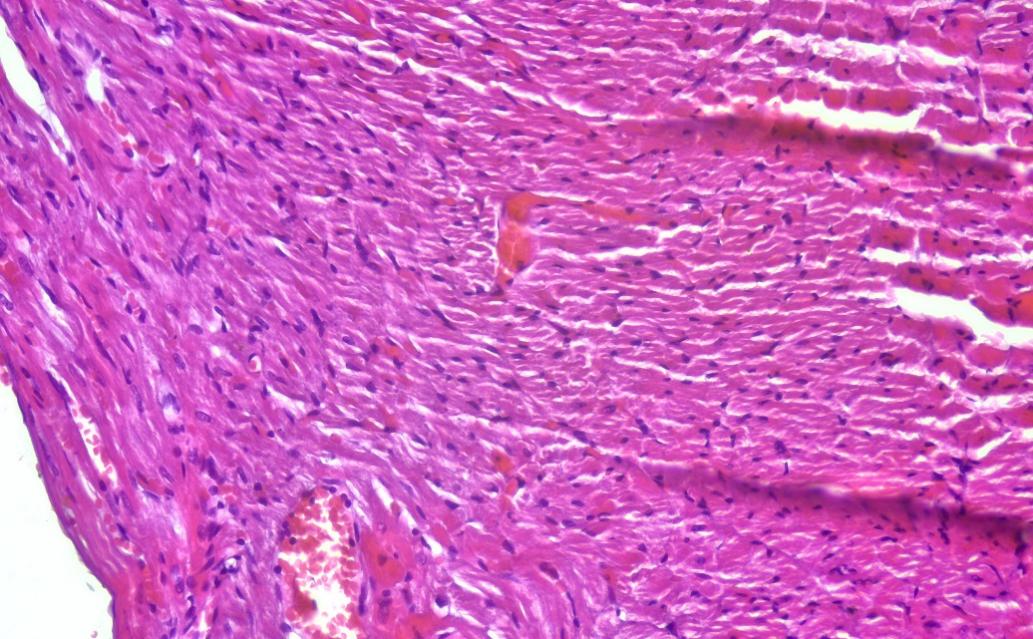 The muscle cells in the intramural layer of the ventricular myocardium are oriented perpendicular to the subendocardial layer. In the interventricular septum, the myocardium is more densely packed, with cardiomyocytes arranged in parallel bundles. The cardiomyocytes in the intramural layer are arranged in parallel, with the volume of myofibrils exceeding the volume of the nucleus. The subepicardial layer is characterized by thin and transversely arranged cardiomyocytes, between which are located arterial and venous vessels.In the myocardium of the ventricles, internal and external longitudinal layers are distinguished, common to the left and right ventricles. The external longitudinal fibers are located close to the surface and cover both ventricles equally. The internal longitudinal layer, on the other hand, passes over the trabeculae and striated muscles, partially bending as it approaches the endocardium. The middle layer of the myocardium consists of circularly oriented cardiomyocytes, which are located in a separate formation in each ventricle. The fibers in this layer are not circular, but pass along the anterior wall, partially bending towards the endocardium. These changes occur gradually and step by step. The cardiomyocytes of the right ventricle are also oriented like those of the left ventricle. The connective tissues in the myocardium are composed of reticular, collagen, and elastic fibers. Reticular and elastic fibers surround cardiomyocytes in ring-like structures of various shapes and sizes. The orientation of these fibers corresponds to the orientation of the cardiomyocytes. Collagen and reticular fibers are found in significant quantities. Reticular fibers are brown in color, appear rough, and form large networks around muscle bundles and blood vessels, and small networks in the epicardium. The blood vessels in the rat heart consist of arterioles, venules, and capillaries, which run in the direction of the cardiomyocytes. Collagen and elastic fibers are also observed around the blood vessels.