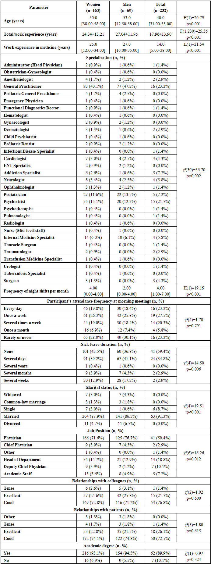 Burnout Syndrome is a psychological condition affecting healthcare professionals, primarily due to high workloads, prolonged patient interactions, and emotional strain. This study aimed to assess burnout levels among physicians in different medical fields and identify factors contributing to its severity. Materials and methods. An observational study was conducted among 208 physicians at medical institutions in Uzbekistan. Participants were divided into two groups: general practitioners (n=173,83.1%) and specialists (n=35,16.9%). Burnout levels were evaluated using the Maslach Burnout Inventory, Boyko’s Emotional Burnout questionnaire, and a specialized rating scale. Burnout prevalence was analyzed based on years of experience, workload, and professional responsibilities. Results. The findings revealed that general practitioners had a significantly higher prevalence of burnout (48.5%) compared to specialists (28.8%). Moderate burnout was more frequent among specialists (32.1%) than among general practitioners (24.6%). Burnout severity increased with years of experience, workload, and responsibility, leading to emotional exhaustion, professional detachment, and reduced motivation. Conclusions. The study highlights the urgent need for psychological support, improved working conditions, and stress management strategies to reduce burnout among physicians. Targeted interventions are necessary to preserve mental well-being and ensure high-quality patient care.