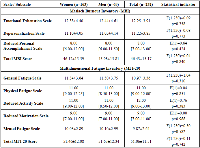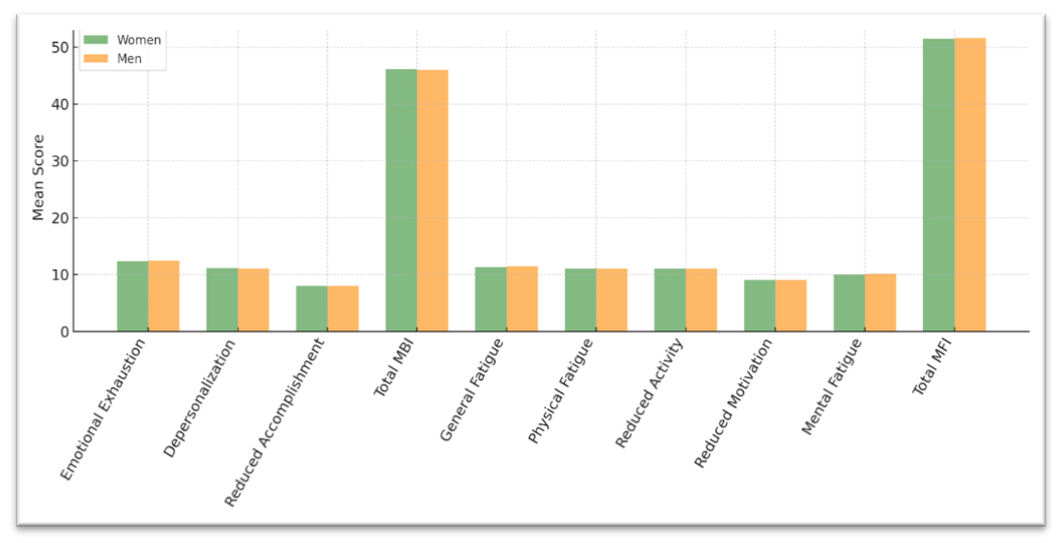 ![]() | Figure 1. Comparison of burnout Fatigue indicators by gender (MBI and MFI-20) |