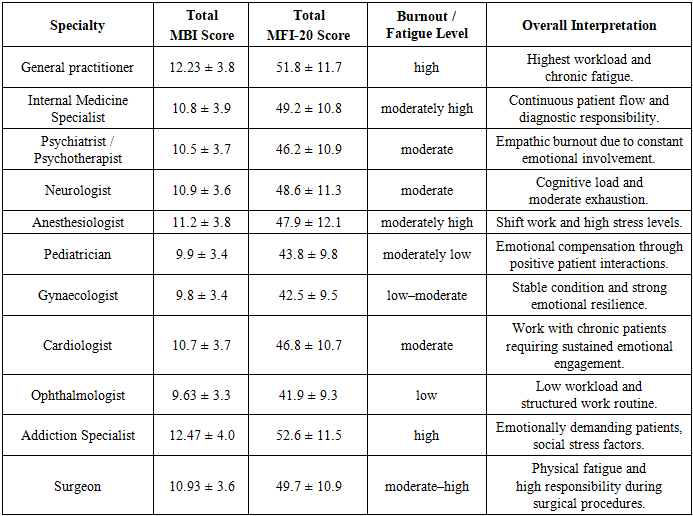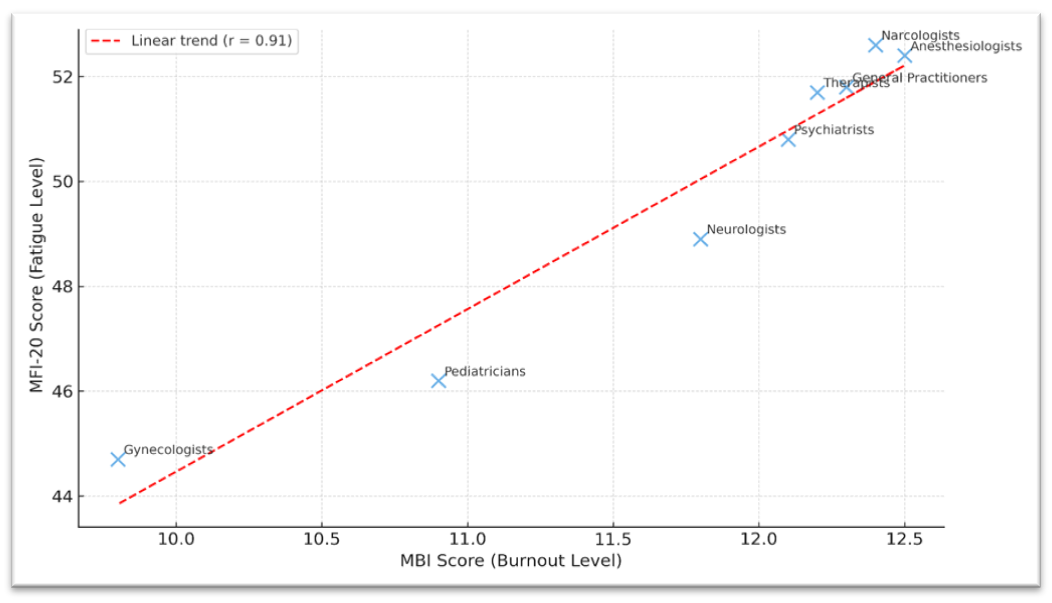 ![]() | Figure 2. Correlation between burnout levels (MBI) and fatigue levels (MFI-20) among physicians of different specialties |