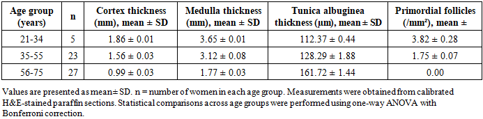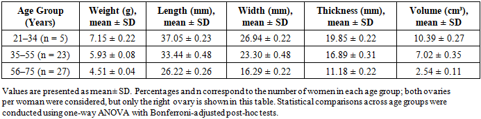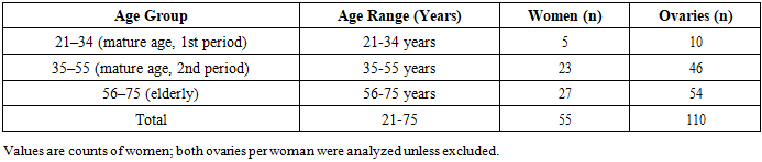 We retrospectively analyzed data from 55 women treated at Carmen PLUS and the Bukhara branch of the RSSAPMCOaR between January 2024 and January 2025. Patient information (age, obstetric/gynecologic history) and histology/morphometry of excised ovaries were reviewed from institutional archives. Only macroscopically and histologically normal ovaries were included; those with cysts, tumors, endometriosis, or inflammatory changes were excluded.The study cohort was stratified into three age groups:21–34 years (n = 5)35–55 years (n = 23)56–75 years (n = 27)In total, 110 ovaries were analyzed. For each ovary, shape, coloration, weight, and external dimensions (length, width, thickness, calculated volume) were recorded. Histological assessment included measurement of cortex and medulla thickness, tunica albuginea thickness, and primordial follicle counts per mm² on calibrated sections. Representative baseline characteristics and ovarian morphology are summarized in Table 1 (age distribution) and Table 2 (macroscopic appearance).Table 1. Distribution of study participants by age group  |