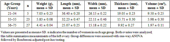 All statistical analyses were performed using SPSS version 26.0 (IBM Corp., Armonk, NY, USA).Normality of data distribution was assessed using the Shapiro–Wilk test.Intergroup comparisons were performed with one-way ANOVA, followed by Tukey’s post-hoc test for multiple comparisons.Right–left ovarian differences were evaluated using paired t-tests.To minimize Type I error, Bonferroni correction was applied for repeated measures, with the adjusted significance threshold set at α = 0.0125.A p < 0.05 was considered statistically significant.Table 4. Morphometric parameters of the left ovary by age group  |