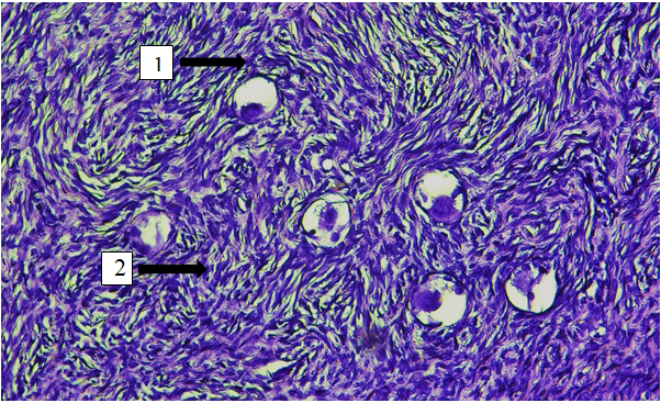 Histological FindingsA total of 110 ovaries were analyzed. Histological assessment focused on the tunica albuginea, cortex, medulla, and the density of primordial follicles.Across all age groups, ovaries exhibited a characteristic tuberous external surface, reflecting repeated ovulatory cycles. Microscopy consistently demonstrated a distinct separation between the tunica albuginea, cortical zone, and medullary zone.Age-related changes were evident in all compartments. Both cortex and medulla thickness decreased progressively with advancing age, paralleled by a marked reduction in primordial follicle density per mm² (Figure 1). These alterations were most pronounced in postmenopausal women, reflecting regression of functional ovarian tissue. | Figure 1. Structure of the ovarian cortex in a woman of reproductive age (42 years old) from the control group. 1 - primordial follicles; 2 - ovarian tissue stroma. Hematoxylin and eosin staining. 10 x 40 magnification |