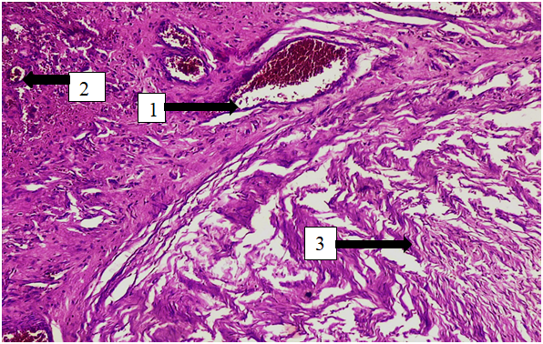 | Figure 2. Structure of atretic ovarian follicles in a perimenopausal woman (49 years old) from the control group. 1 – congestion of small and large vessels; 2 – small atretic follicles; 3 – age-related fibrosis and edema of ovarian tissue. Staining: hematoxylin and eosin. 10 x 40 magnification |