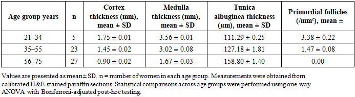 Quantitative morphometric parameters for the cortex, medulla, and tunica albuginea across age groups are summarized in Tables 5 and 6.Table 5. Morphometric parameters of the right ovary by age group  |