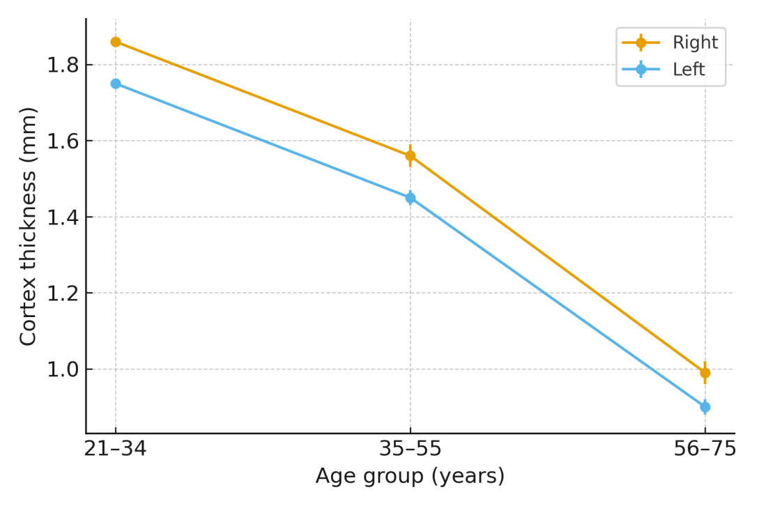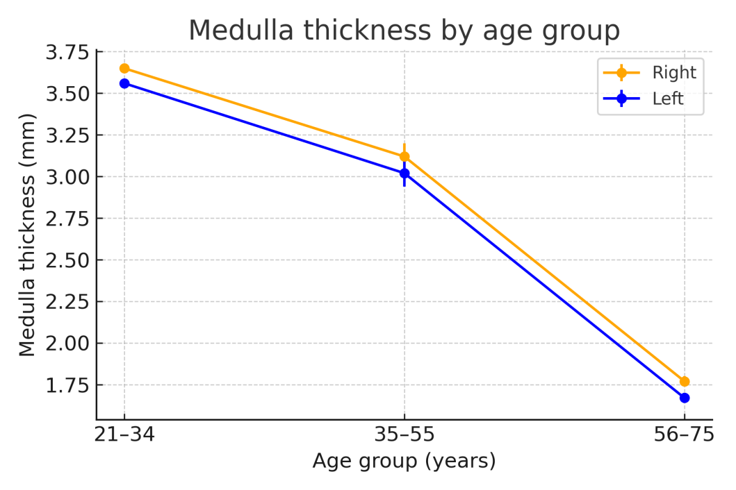 Cortical thickness also showed significant reduction with age. In women aged 21–34 years, mean cortex thickness measured 1.86 ± 0.01 mm (right) and 1.75 ± 0.01 mm (left). These values declined to 1.56 ± 0.03 and 1.45 ± 0.02 mm, respectively, in women aged 35–55 years, and further to 0.99 ± 0.03 and 0.90 ± 0.02 mm in women aged 56–75 years (p < 0.001, ANOVA; Figure 5). | Figure 5. Medulla thickness by age group. Mean ± SD for right (gold) and left (blue) ovaries. Medullary thickness decreased significantly with age, from 3.65 ± 0.01 mm and 3.56 ± 0.01 mm in women aged 21–34 to 1.77 ± 0.03 mm and 1.67 ± 0.03 mm in women aged 56–75 (p < 0.001, ANOVA) |