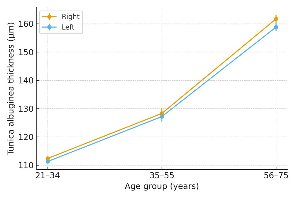 Quantitative analysis demonstrated a progressive thickening of the tunica albuginea with advancing age (Tables 5 and 6; Figure 3). In women aged 21–34 years, mean tunica thickness was 112.37 ± 0.44 µm in the right ovary and 111.29 ± 0.25 µm in the left. This increased significantly in the 35–55 year group (128.29 ± 1.88 µm and 127.18 ± 1.81 µm, respectively) and further in women aged 56–75 years (161.72 ± 1.44 µm and 158.80 ± 1.40 µm; p < 0.001, ANOVA). | Figure 3. Cortex thickness by age group. Mean ± SD for right (gold) and left (blue) ovaries in women aged 21–34, 35–55, and 56–75 years. Cortex thickness declined progressively with age, from 1.86 ± 0.01 mm (right) and 1.75 ± 0.01 mm (left) in women aged 21–34 to 0.99 ± 0.03 mm and 0.90 ± 0.02 mm, respectively, in women aged 56–75. The reduction was statistically significant across age groups (p < 0.001, ANOVA) |
