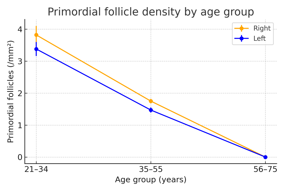| Figure 6. Primordial follicle density by age group. Mean ± SD for right (gold) and left (blue) ovaries. Follicle density was highest in women aged 21–34 (3.82 ± 0.28 vs. 3.38 ± 0.22 follicles/mm²) and declined sharply in women aged 35–55 (1.75 ± 0.07 vs. 1.47 ± 0.08 follicles/mm²), becoming nearly absent in women aged 56–75. Differences across age groups were statistically significant (p < 0.001, ANOVA) |