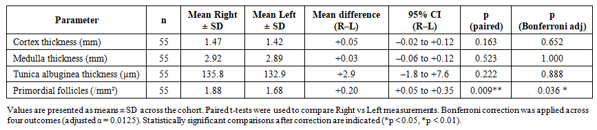 Right–Left Asymmetry Paired comparisons of morphometric parameters between right and left ovaries are summarized in Table 7. No statistically significant differences were observed for cortex thickness, medulla thickness, or tunica albuginea thickness after Bonferroni correction (all adjusted p > 0.05). In contrast, primordial follicle density was significantly higher in the right ovary compared with the left (mean difference +0.20 /mm², 95% CI 0.05–0.35; p = 0.009, Bonferroni-adjusted p = 0.036). This finding suggests a modest but consistent right-sided advantage in follicular reserve.