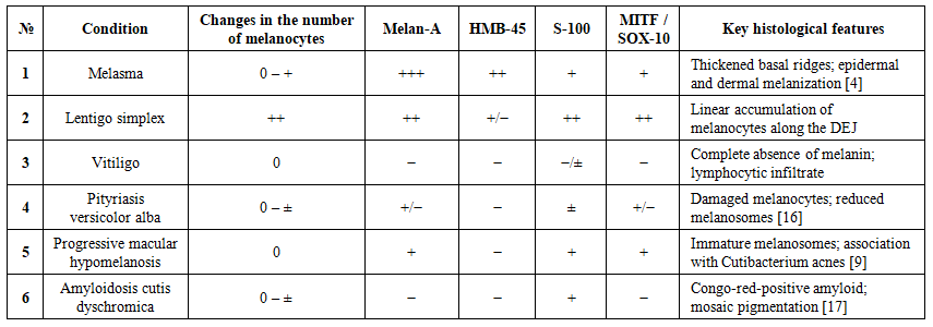 Changes in pigmentation are associated with either the quantity or function of melanocytes. Complete absence of MART-1/MITF/S-100 staining indicates melanocytopenia (vitiligo-like foci, < 1 cell·mm−1). In hyperpigmentations (melasma, lentigo simplex), Melan-A reveals normal or moderately increased cell numbers; excess pigment is due to enhanced melanogenesis [4]. HMB-45 marks only active premelanosomes, remaining negative in "dormant" cells and thus reflecting their functional status. S-100 is highly sensitive but non-specific, therefore it is used only in combination with other markers. Nuclear MITF and SOX-10 possess the highest specificity, detecting individual melanocytes with heterogeneous expression of melanin-associated antigens. Thus, the extended panel of MART-1/HMB-45/S-100/MITF/SOX-10 provides accurate differentiation between hyper- and hypopigmentations and supports the conclusions of our dissertation.