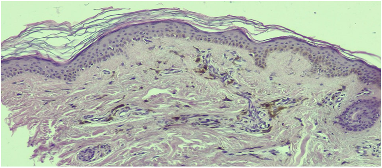 | Figure 2. Diagnosis: persistent dyschromic erythema. The epidermis shows an uneven decrease in the thickness of the spinous layer and hyperpigmentation of the basal layer. In the dermis, a sparse histiocytic infiltrate with a mixture of melanophages is observed |