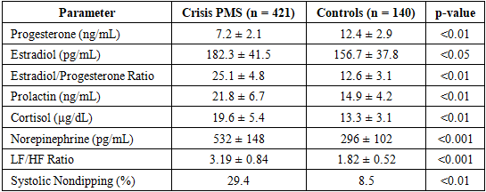 This study was conducted as a prospective, observational, multi-phase clinical investigation at a tertiary gynecologic and neuroendocrine center, focusing on the diagnosis and monitoring of the crisis form of premenstrual syndrome (PMS). The research covered a four-year period between January 2021 and December 2024, during which standardized endocrine and cardiovascular monitoring protocols were applied. All diagnostic and evaluative procedures followed institutional guidelines established after the 2021 modernization of hormonal laboratory systems [6]. Ethical approval was granted by the institutional research committee, and written informed consent was obtained from all participants aged 18 and above. For participants aged 15–17 years, parental or guardian consent was additionally obtained, in accordance with international standards for adolescent research ethics [7]. Study Population A total of 458 females aged 15–25 years presenting with symptoms suggestive of the crisis form of PMS were screened. After applying exclusion criteria, 421 patients were included in the final analysis.Inclusion criteria were as follows:• recurrent crisis-type PMS episodes for at least three consecutive menstrual cycles;• presence of at least one crisis component: hypertensive surge, tachycardia crisis, sympathetic overactivation, panic-like episodes, acute irritability, or sudden vegetative instability;• clear symptom resolution within 24–48 hours after menstrual onset;• absence of chronic cardiovascular, adrenal, or thyroid disorders;• no hormonal therapy for ≥ 6 months prior to enrollment.A comparison control group of 140 age-matched healthy females with regular cycles and no PMS history was assessed to determine normative hormonal values [8]. All participants underwent standardized clinical assessment at two time points:1. Late luteal phase (3–6 days before menstruation)2. Early follicular phase (days 2–4 of menstruation)Clinical evaluation included:• blood pressure (supine and standing) measured with automated oscillometric devices;• 5-minute heart-rate variability (HRV) analysis to quantify autonomic balance;• PMS severity scoring using the validated Crisis-PMS Symptom Scale (CPMSS) developed in 2022 [9];• assessment of neurovegetative symptoms (tremor, sweating, flushing, paresthesia);• psychological screening for acute anxiety markers using the Short-Form Anxiety Index.Luteal-phase hypertensive crises were defined as systolic BP ≥ 150 mmHg or heart rate ≥ 110 bpm during symptomatic episodes. Hormonal and Biochemical Assays.All endocrine measurements were obtained during the late luteal phase, when crisis symptoms occur most frequently. Blood samples were collected between 07:30 and 09:00 AM after an overnight fast.Measured hormonal parameters included:• Progesterone (P4)• Estradiol (E2)• Prolactin (PRL)• Cortisol (morning fraction)• Norepinephrine (NE)• Epinephrine (EPI)• Serotonin (5-HT)Assays were conducted using fourth-generation electrochemiluminescent analyzers introduced in early 2022, ensuring high precision in low-range hormone concentrations [10]. Catecholamines were measured by high-performance liquid chromatography (HPLC), following 2023 analytical standards. mMetabolic markers included fasting glucose, insulin, HOMA-IR, and serum lipids, as metabolic dysregulation can exacerbate PMS severity through amplification of sympathetic reactivity [11]. To quantify crisis-related autonomic instability, the following methods were used:• 24-hour ambulatory blood pressure monitoring (ABPM) with emphasis on nocturnal dipping patterns;• Heart-rate variability (HRV) spectral analysis to evaluate sympathetic–parasympathetic balance;• 5-minute orthostatic challenge with continuous heart-rate monitoring;• Sympathetic Reactivity Index (SRI) calculated using validated 2023 algorithms [12].Crisis episodes were documented through structured diaries and confirmed via synchronous cardiovascular recordings. Transvaginal or transabdominal pelvic ultrasound (depending on age and sexual activity) was performed to exclude structural or organic pelvic pathology. The following parameters were assessed:• endometrial thickness in late luteal phase;• ovarian follicular distribution;• corpus luteum morphology;• luteal vascularization via Doppler (RI and PI indices).Luteal insufficiency was determined based on established Doppler patterns and diminished corpus luteum perfusion [13]. Data were analyzed using updated statistical software (2024 version). Continuous variables were reported as mean ± SD; categorical variables as frequencies and percentages.• Between-group comparisons: t-tests or Mann–Whitney U.• Year-to-year comparisons (2021–2024): ANOVA with Bonferroni correction.• Correlation analyses: Pearson or Spearman correlation.• Predictors of crisis severity: multivariate linear regression with hormonal and autonomic variables.• Significance threshold: p < 0.05.Missing data were processed using multiple imputation following validated endocrine data handling guidelines [14].