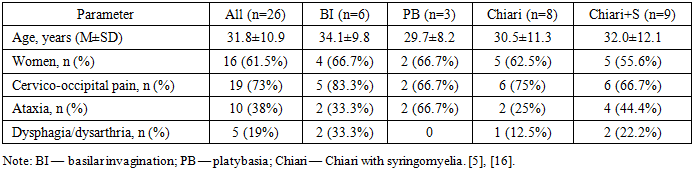 Demographic and Clinical Characteristics Mean age was 31.8±10.9 years; 61.5% were women. Predominant complaints: cervico‑occipital pain (73%), vertigo (42%), ataxia (38%), dysarthria/dysphagia (19%). Pyramidal signs and dissociated sensory disturbances were more frequent in Chiari with syringomyelia, while static ataxia predominated in platybasia.Table 1. Baseline characteristics by group  |