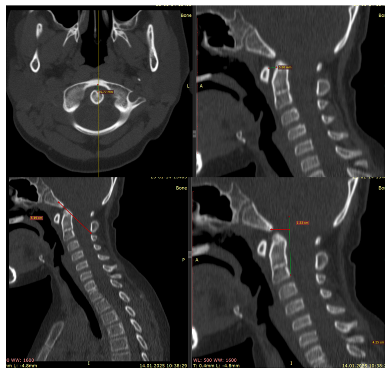 Craniometry and Neuroimaging The frequency of abnormalities in key metrics differed between groups. In basilar invagination, abnormal values of the Harris line, ADI, and Cruveilhier joint were more frequently observed; in Chiari malformations, combined abnormalities of the Grabb-Oakes curve, Chamberlain/McGregor lines, and dorsal balance indices (Schmidt-Fischer, CVA) were more common. | Figure 1. CT craniometric indices (Harris line, atlanto‑dens interval, Wackenheim line) indicating ventral compression and craniocervical instability |