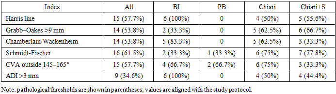 Study design: single‑center case series (n=26). Inclusion criteria: confirmed CCJ anomalies on MRI/MDCT and the presence of clinical symptoms or neurophysiological deviations. Groups: basilar invagination (n=6), platybasia (n=3), Chiari malformation (n=8), and Chiari with syringomyelia (n=9). [4], [9], [17].Neuroimaging: brain and cervical MRI (T1/T2; assessment of tonsillar ectopia, syringomyelia, medullary compression); functional MDCT of the CCJ (flexion/extension); 3D CT for posterior fossa volume calculation. Craniometry: Grabb–Oakes (normal ≤9 mm), Chamberlain (>5 mm) and McGregor (>10 mm) lines, Harris (≤12 mm), Redlund‑Johnell & Hansson (≤8 mm), Schmidt‑Fischer (124–127°), CVA (145–165°), Klaus index (30–35 mm), ADI (≤3 mm), Cruveilhier joint (≤4 mm), Wackenheim line. Neurophysiology: BAEPs (latencies RI–RV; interpeak intervals RI–RV and RIII–RV; amplitudes); stimulation EMG (conduction velocity and M‑wave amplitude) in the median and tibial nerves. Statistics: descriptive measures (mean±SD), intergroup comparisons using two‑tailed t‑tests, significance set at p<0.05. [11], [12], [13].