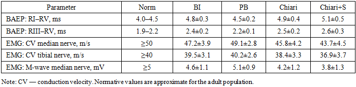 Diagram 2 shows how radiological abnormalities vary across key criteria in four groups of patients with CVD pathology. It illustrates this well: Maximum abnormalities across most criteria are seen in patients with basilar invagination. A significant decrease in posterior cranial fossa volume is seen only in patients with platybasia. Moderate but multiple abnormalities are seen in Chiari malformation, especially when combined with syringomyelia.Neurophysiology (BAEP, EMG) In the Chiari and Chiari+S groups, BAEP latencies RIII and RV were prolonged, the RI–RV and RIII–RV intervals widened (p<0.05–0.01). EMG showed reduced conduction velocity in the median and tibial nerves, more prominent in the upper limbs; with syringomyelia, M‑wave amplitudes were depressed.Table 3. Neurophysiological parameters (M±SD)  |