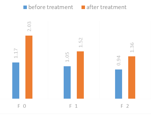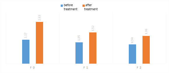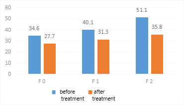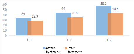 As NAFLD progresses, not only do morphofunctional changes occur in the liver, but systemic disorders affecting the cardiovascular system also develop. One important clinical aspect is the dynamics of blood pressure (BP), which reflect the extent of vascular regulation involvement in the pathological process.In patients with NAFLD at the initial stage of fibrosis (F0), BP values remained within the physiological norm: systolic BP averaged 119.6 mmHg, and diastolic BP was 78.7 mmHg. In patients at the F1 stage, sub-hypertensive increases in BP were observed (SBP: 132.1 mmHg; DBP: 85.2 mmHg), indicating the onset of vascular regulation disturbances. At the F2 stage, values corresponding to grade 1 arterial hypertension were recorded (SBP: 142.3 mmHg; DBP: 90.3 mmHg), confirming cardiovascular system involvement in the pathological process.As part of the comprehensive treatment, the hepatoprotective drug Phosphogliv Urso (1 tablet twice a day) was used, along with the angiotensin-converting enzyme (ACE) inhibitor lisinopril (5 mg once a day) for antihypertensive purposes, over a two-month period. Lisinopril was selected because it is excreted unchanged by the kidneys in its active form, without undergoing hepatic metabolism.All patient groups showed a statistically significant reduction in blood pressure:- F0 stage: Systolic BP decreased to 110.1 mmHg, and diastolic BP to 70.5 mmHg.- F1 stage: Systolic BP decreased to 120.5 mmHg, and diastolic BP to 75.4 mmHg.- F2 stage: Systolic BP decreased to 121.7 mmHg, and diastolic BP to 77.6 mmHg.These results confirm the effectiveness of the combined therapy, including the use of Phosphogliv Urso and lisinopril, in reducing blood pressure and potentially mitigating cardiovascular risks in patients with NAFLD at various stages of liver fibrosis.These changes indicate the effectiveness of the ongoing therapy in controlling blood pressure even in patients with advanced liver fibrosis. The likely mechanisms of improvement include the reduction of systemic inflammation, normalization of the metabolic profile, and improvement of vascular tone due to the comprehensive approach to treating NAFLD. Considering the high risk of cardiovascular complications with progressive fibrosis, especially at stages F1–F2, regular blood pressure monitoring and the use of antihypertensive therapy should be regarded as important components of managing patients with NAFLD.Thus, regular blood pressure monitoring and the inclusion of antihypertensive therapy as part of the comprehensive treatment for patients with NAFLD are particularly relevant at fibrosis stages F1–F2, when the risk of cardiovascular complications increases.As is well known, alanine aminotransferase (ALT) is one of the key enzymes reflecting the degree of cytolytic damage to hepatocytes. Elevated activity of this enzyme is characteristic of inflammatory and destructive processes in the liver, making this indicator an important marker of non-alcoholic steatohepatitis activity. | Figure 1. Changes in alanine aminotransferase (ALT) levels before and after treatment depending on the stage of liver fibrosis |