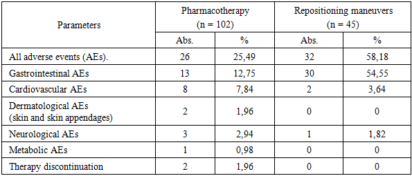 It should be noted that the occurrence of adverse events (AEs) was relatively high: 26 patients (25.49%) experienced AEs due to pharmacotherapy, and 32 patients (58.18%) due to repositioning maneuvers. These events most commonly manifested as nausea and vomiting, as well as elevated blood pressure (attributable to glucocorticoid use).No patients discontinued treatment following repositioning maneuvers, whereas 2 patients (1.96%) receiving pharmacotherapy had to interrupt therapy due to increased blood pressure.