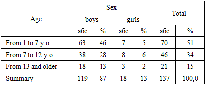 The study is based on an analysis of anesthesia effectiveness in 137 children aged 1 to 14 years who underwent endourological surgeries at the Tashkent Pediatric Medical Institute (Table 1).Table 1. Distribution of patients accordingly to age and sex  |