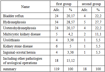 The majority of the examined patients belonged to the age group of 1 to 7 years. The maximum age of the patients was 14 years, while the minimum age was 1 year.The somatic status of the patients according to the ASA classification corresponded to classes I–II. Out of 137 children, 97 (70%) were in satisfactory condition before surgery, with their somatic status corresponding to ASA I, characterized by the absence of systemic disorders. Children with an ASA II somatic status accounted for 30%, which represents mild systemic disturbances without functional impairments (e.g., weight and height deficiency, slight hemoglobin reduction compared to age norms).All patients were divided into two groups depending on the anesthesia method used.Group 1 (119 children): Combined general anesthesia (CGA).Group 2 (18 children): Combined inhalation anesthesia (CIA).Table 2. Distribution of patients by the nature of surgical pathology  |