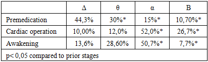 EEG studies during combined inhalation anesthesia did not reveal significant suppression of the bioelectrical activity of the cerebral cortex. It should be noted that the EEG dynamics correlated with the clinical signs of anesthesia depth. It was observed that changes in the frequency spectrum of the EEG occurred with the administration of minimal doses of the anesthetic (Table 3).Table 3  |