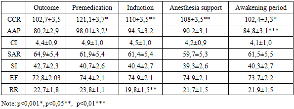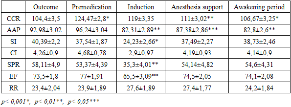 Thus, the EEG results indicate the absence of deep suppression of the bioelectrical activity of the cerebral cortex, which explains the rapid and complete recovery of neuropsychological status after the surgery.The considered method of combined general anesthesia with propofol and ketamine ensures effective protection of the child's body from surgical trauma. This is evidenced by stable EEG parameters and clinical observations during the surgical intervention.To evaluate the effectiveness of anesthetic management, the state of hemodynamic parameters was studied at different stages of the surgical procedure. The normative values for central and peripheral hemodynamics were based on data proposed by T.S. Agzamkhodzhaev et al. (2018), developed at the Tashkent Pediatric Medical Institute. For patients in Group 1, who underwent combined intravenous anesthesia (CIVA), changes in hemodynamic parameters during anesthesia for endourological surgeries are presented in Table 4. An increase in systolic arterial pressure (SAP) during the premedication period by 12% compared to baseline values was noted. However, during the induction stage, there was a statistically significant decrease in SAP (from 98.01±3.2 to 94.58±1.05), amounting to 5%. By the awakening stage, SAP decreased by 15% compared to the second stage and approached baseline values. The arterial hypertension observed during the premedication period was associated with the sympathomimetic effect of ketamine. Heart rate (HR) also showed significant fluctuations during the study stages. This trend was most pronounced during the premedication stage, with an HR increase of 11.8% (from 102.7±3.5 to 121.05±1.09). During the induction period, a statistically significant decrease in HR was observed (p<0.05). By the awakening stage, HR values became identical to baseline. The increase in HR was attributed to the effect of the anticholinergic drug, 0.1% atropine sulfate. troke volume index (SVI) increased by 7% after premedication. At other stages of anesthesia, SVI values were similar to baseline.Table 4. Hemodynamic parameters in patients with combined general anesthesia of propofol in combination with ketamine (М ± m)  |