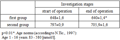 During the anesthesia stages, a tendency for SVI to decrease was observed. SVI decreased by 36% during the induction period compared to the premedication stage. CI decreased by 37% compared to the second anesthesia stage. A statistically significant reduction in CI (p<0.05) was noted during the third anesthesia stage compared to baseline values. The hemodynamic response to SVI reduction was manifested by a chronotropic compensatory increase in HR to maintain adequate CI.TPR also showed a tendency to decrease during the induction period by 35% compared to the second anesthesia stage, indicating a sharp drop in vascular resistance. The contractility index increased by 10% during the second stage of anesthesia compared to the first stage, while it decreased by 16% during the induction period. RR increased by 15% during the induction period compared to the premedication stage.The levels of cortisol, capnography, and the features of the awakening period during combined general anesthesia with propofol are being examined (Table 6). In response to surgical intervention, the body develops a protective and adaptive reaction aimed at ensuring the adaptation of vital functions under conditions of surgical stress. While reflex mobilizing actions lead to an increased release of essential regulatory hormones and energy-supplying metabolites into the bloodstream for working tissues, neurohumoral mechanisms contribute to tuning organs—effectors—to various levels of metabolic activity. The primary task of anesthetic management under these conditions is to prevent dangerous pathological reactions to surgical stress and to stabilize the functioning of vital systems and the body's metabolism.Table 6. Dynamics of cortisol content in the blood during surgical intervention in the conditions of CGA and CIA  |