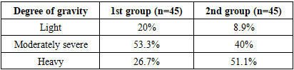 The study included 90 patients with a confirmed diagnosis of NSUC and 30 practically healthy individuals who constituted the control group. Patients with NCA were divided into two clinical groups: unoperated patients (n=45) and patients who were in the postoperative period after colon resection or colectomy (n=45). The average age of the examined was 38.2±10.5 years; the proportion of men and women was 60% and 40%, respectively. The active phase of the disease was observed in 86.6% of patients, confirming the high frequency of recurrent and progressive NSUC course.When assessing the severity of the disease according to the Truelove-Witts scale, it was established that the moderate form of the disease prevailed in patients who did not undergo surgery, while in the second group (after surgery), severe forms of NSUC were observed significantly more often (Table 1).Table 1. Distribution of patients by clinical severity of NSUC  |