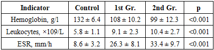 The data indicate a more severe clinical course in the operated patients. Surgical intervention, as a rule, is a consequence of prolonged inflammation, therefore, the high proportion of severe forms in the second group is natural and emphasizes the need for comprehensive correction of metabolic disorders.Analysis of the general blood test indicators revealed statistically significant deviations in patients of both groups compared to the control. The most pronounced disorders were anemic syndrome and increased inflammatory markers (Table 2).Table 2. General blood test indicators  |