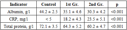 Anemia was detected in the vast majority of patients, and its severity correlated with the activity of inflammation. A higher level of inflammatory markers (leukocytes and ESR) in patients of the second group confirms the persistence of the inflammatory process even after surgery.Biochemical blood analysis revealed significant protein metabolism disorders and a sharp increase in the level of C-reactive protein (Table 3).Table 3. Biochemical indicators in patients with NSUC  |