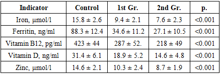 Hypoalbuminemia reflects pronounced catabolism and disruption of the body's synthetic function against the background of systemic inflammation. Increased CRP confirms the activity of the inflammatory process, which is especially pronounced in patients after surgery.One of the key research results was the identification of pronounced micronutrient deficiency in patients with NSUC. The most significant deviations were observed in the levels of iron, ferritin, vitamins D and B12, as well as zinc (Table 4).Table 4. Micronutrient status of the examined patients  |