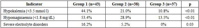The study included 118 patients, distributed as follows: Group 1 (standard management) - 43 patients; Group 2 (active electrolyte correction) - 38 patients; Group 3 (combined prevention) - 37 patients.The groups were comparable by age, sex, tumor localization, and chemotherapy types. The highest number of deviations was noted in the standard management group (Table 1).Table 1. Electrolyte disorder frequency  |