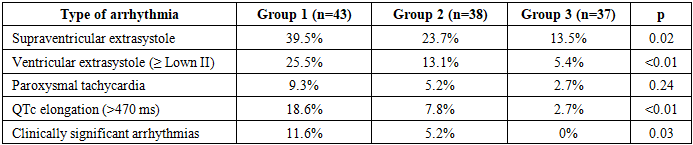 Analysis of the frequency of electrolyte disturbances showed pronounced differences between the groups. In group 1 (standard management), hypokalemia was detected in 44.1% of patients, and hypomagnyemia in 53.4%, which indicates a high frequency of spontaneous electrolyte imbalance disorders without prevention. In 16.2% of patients in group 1, severe electrolyte disorders were diagnosed, requiring urgent correction.In the 2nd group (active electrolyte correction), the frequency of hypokalemia decreased by more than 2 times (21.0%), and hypomagnesemia - by almost 2 times (28.9%) compared to the standard treatment. The proportion of severe disorders was also significantly lower (5.2%), which confirms the effectiveness of regular monitoring and targeted correction of K+ and Mg2+ levels.The most favorable indicators were noted in group 3 (combined prevention): hypokalemia was registered only in 10.8% of patients, hypomagnesia - in 13.5% of patients, and no cases of severe electrolyte disorders were detected. The obtained differences are statistically significant (p<0.05) and demonstrate the combined effect of electrolyte correction and cardioprotective therapy.The results of the arrhythmia frequency are presented in Table 2.Table 2. Arrhythmia frequency results  |