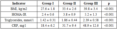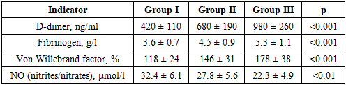 Analysis of the initial data revealed significant differences in metabolic and inflammatory status between patient groups (p<0.001 for all indicators), reflecting the influence of obesity on the severity of metabolic disorders in COVID-19.In patients of Group I, the body mass index corresponded to excess body weight, while HOMA-IR values indicated moderate insulin resistance. Triglyceride levels and CRP concentration were characterized by a moderate increase, reflecting the moderate degree of systemic inflammation typical for the uncomplicated course of COVID-19.In group II, which included patients with obesity of I-II degree, a significant increase in BMI and the insulin resistance index was noted. An increase in triglyceride levels against the background of CRP growth indicated the formation of pronounced metabolic dysfunction associated with an increased inflammatory response.The most unfavorable initial indicators were identified in patients of Group III. They recorded maximum BMI values and HOMA-IR, reflecting deep insulin resistance, as well as the highest levels of triglycerides and CRP, indicating pronounced systemic inflammation. The combination of these changes forms a high-risk metabolic-inflammatory phenotype, contributing to the aggravation of COVID-19 and an increase in the likelihood of complications.To more deeply assess the vascular and thrombotic mechanisms underlying the complicated course of COVID-19 in obese patients, an analysis of endothelial function and hemostasis system indicators was conducted. Considering the proven role of endothelial dysfunction and hypercoagulation in the pathogenesis of COVID-19, the inclusion of these markers made it possible to clarify the degree of vascular damage and thrombotic risk depending on the severity of metabolic disorders (Table 2).Table 2. Endothelial function and hemostasis indicators  |
