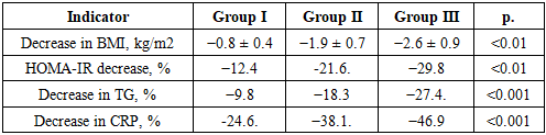 In the post-COVID period, all examined patients showed positive dynamics in metabolic and inflammatory indicators, which indicates the effectiveness of the ongoing therapeutic and preventive measures.In patients of Group I, a moderate decrease in body mass index and insulin resistance indicators was observed, reflecting a partial restoration of metabolic balance after the infection.In group II, the dynamics were more pronounced: a decrease in BMI and HOMA-IR indicators was accompanied by a significant decrease in triglycerides and CRP, indicating a decrease in inflammatory activity and an improvement in tissue sensitivity to insulin.The most significant positive dynamics were recorded in patients of Group III, where the decrease in insulin resistance, triglycerides, and CRP reached maximum values (p<0.001). This confirms that complex metabolic correction in the post-COVID period is especially effective in patients with severe obesity, allowing for a reduction in the severity of chronic inflammation and a decrease in the risk of developing long-term cardiometabolic complications.