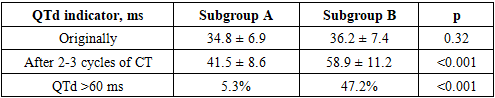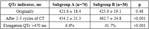 To assess the prognostic significance of the QTc interval, a comparative analysis of its initial values and dynamics during chemotherapy was conducted in patients without clinically significant arrhythmias (subgroup A) and in patients with registered clinically significant or life-threatening arrhythmias (subgroup B). The QTc assessment was conducted before the start of antitumor treatment and after 2-3 cycles of chemotherapy (Table 1).Table 1. Dynamics of the QTc interval in patients depending on the development of arrhythmias  |