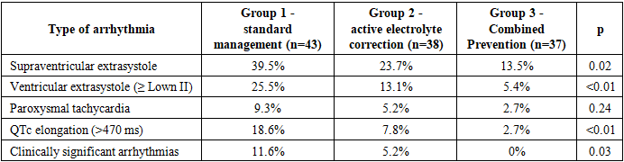 The results of the analysis of the frequency of arrhythmias showed pronounced differences between the studied groups. In the standard management group, supraventricular extrasystole was detected in 39.5% of patients, and ventricular extrasystole ≥ Lown II - in 25.5%, which was the highest indicator among all groups. Elongation of the QTc interval (>470 ms) was noted in 18.6% of patients, and clinically significant arrhythmias requiring changes in treatment tactics or enhanced monitoring were registered in 11.6% of patients.In the group with active electrolyte correction, a significant decrease in the frequency of rhythm disturbances was observed: supraventricular extrasystole decreased to 23.7%, ventricular extrasystole to 13.1%, and prolongation of QTc was recorded in only 7.8% of patients. The frequency of clinically significant arrhythmias also decreased and amounted to 5.2%.The most pronounced prophylactic effect was noted in the combined prophylaxis group, where supraventricular arrhythmias were detected in 13.5% of patients, ventricular arrhythmias - in 5.4%, and prolongation of QTc - only in 2.7%. Clinically significant arrhythmias were not registered in this group.Statistical analysis confirmed significant differences between groups in the frequency of ventricular arrhythmias and the lengthening of the QTc interval (p<0.01), which emphasizes the key role of active correction of electrolyte disorders and cardioprotective therapy in reducing the risk of therapy-induced heart rhythm disorders.