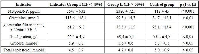 Table 1 presents comparative laboratory and biochemical indicators in patients with chronic heart failure, depending on the left ventricular ejection fraction, as well as in the control group. The analysis was conducted to assess the severity of cardiorenal and metabolic imbalances with reduced and preserved myocardial systolic function (table 1).Table 1. Cardiospecific and general laboratory indicators in patients with CHF and in the control group, (M ± SD)  |